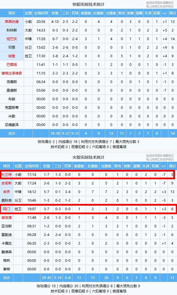 申京13分7板2助3斷、史密斯9分5板2助、阿門6分3板2助、霍勒迪6分、謝潑德5分4板、卡佩拉4分2板、奧科吉3分2板、杜蘭特3分1助、亞當(dāng)斯2分3板2助