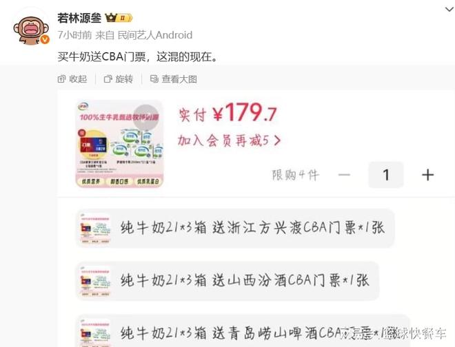 這個有網(wǎng)友就透露,在某電商網(wǎng)站上,甚至已經(jīng)有人開始盯上CBA聯(lián)賽了。他們已經(jīng)將CBA門票當(dāng)做是贈品送出了。根據(jù)該網(wǎng)友透露,已經(jīng)有賣家在網(wǎng)絡(luò)上打出了買牛奶送CBA門票的優(yōu)惠了。而從他們提供的門票中,也大部分是關(guān)注度不高的球隊。像廣東、遼寧以及北京這些球隊,他們并沒有送票,送的基本都是寧波、天津以及江蘇等門票。不過,值得一提的是,衛(wèi)冕冠軍廣廈隊,他們也在送票行列中。