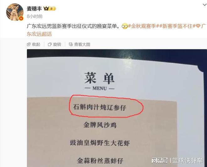 北京時(shí)間12月12日,CBA新賽季揭幕戰(zhàn)正式打響,作為聯(lián)盟中的豪門球隊(duì),廣東隊(duì)也即將正式開啟新賽季。而在新賽季出征儀式上,廣東隊(duì)總經(jīng)理朱芳雨也是豪言壯語,他直言廣東隊(duì)今夏一系列瘋狂舉動(dòng),為的就是新賽季全力沖擊第12冠。不過,在廣東隊(duì)這一次出征晚宴上,他們的第一道菜卻非常有趣——石斛肉汁燉遼參仔??礃幼?,廣東隊(duì)新賽季第一刀還是針對遼寧隊(duì)。