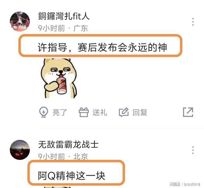 對于許利民的賽后總結(jié),網(wǎng)友們也是紛紛吐槽?!澳瓦@一套詞兒說兩年了”;“沒看到希望,只看到了絕望?!?;“許指導,賽后發(fā)布會永遠的神”;“阿Q情神這塊”;“你是真固執(zhí)。第三節(jié)那個陣容你是真敢安排?!保弧坝肋h充滿希望,永遠熱淚盈眶,永遠豪情滿懷,永遠坦坦蕩蕩?!?;“又是精神勝利,經(jīng)典發(fā)布會逆轉(zhuǎn)”……