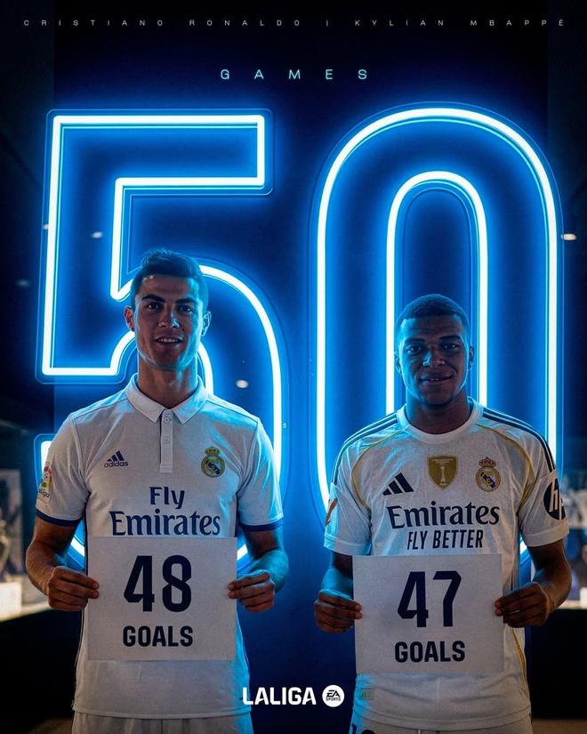 據(jù)統(tǒng)計(jì),西甲歷史上只有C羅前50場比賽的進(jìn)球數(shù)比姆巴佩更多,C羅在代表皇馬出戰(zhàn)的前50場西甲比賽中打入了48球。