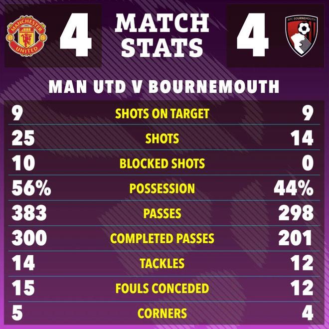曼聯(lián)自1984年10月以來,每當(dāng)主場(chǎng)半場(chǎng)結(jié)束時(shí)領(lǐng)先,就從未輸過比賽。但下半場(chǎng)剛開始不到60秒,曼聯(lián)就丟球了。約羅造越位失敗,埃萬尼爾森接到隊(duì)友的直塞單刀破門,曼聯(lián)2-2伯恩茅斯。