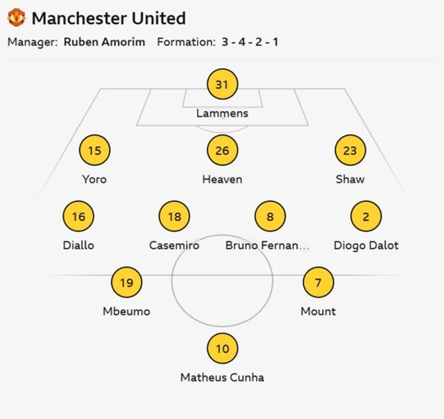 本場(chǎng)比賽,摩洛哥拒絕了曼聯(lián)讓馬茲拉維留隊(duì)參賽的要求,但姆貝莫和阿馬德·迪亞洛獲準(zhǔn)上陣。魯本·阿莫林用萊尼·約羅替代了馬茲拉維的右中衛(wèi)位置,并且繼續(xù)排出無鋒陣容。