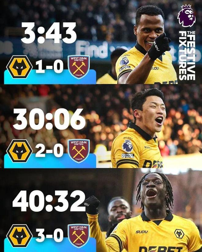 本賽季,英超最大的懸念并非誰能奪冠,而是排名墊底的狼隊(duì)何時(shí)才能拿到賽季首勝。而在第20輪比賽中,這一懸念終于迎來了答案。狼隊(duì)坐鎮(zhèn)主場半場便3-0領(lǐng)先西漢姆聯(lián),阿里亞斯首開紀(jì)錄,韓國前鋒黃喜燦傳射建功,馬特烏斯·馬內(nèi)造點(diǎn)+破門,最終成功拿到了賽季首勝。而作為對(duì)手的西漢姆聯(lián),他們在前狼隊(duì)主帥努諾的帶領(lǐng)下已經(jīng)連續(xù)9輪比賽不勝,深陷英超保級(jí)區(qū)。